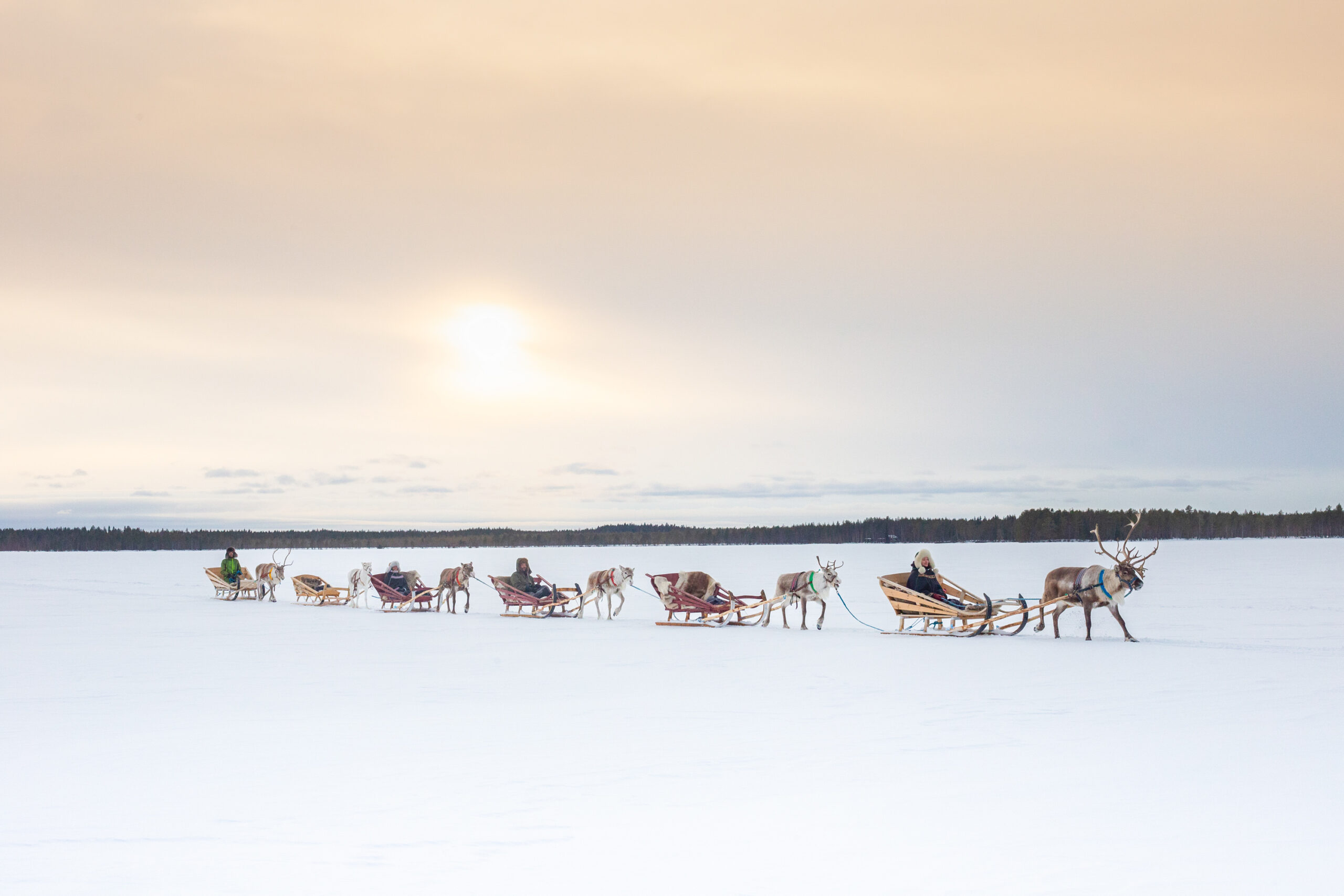 Embark on an unforgettable safari through snow-covered forests and wide open marshes. All you have to do, is sit back in the sleigh and enjoy the ride! A reindeer-drawn sleigh takes you deep into the peaceful nature of Ylikiiminki, partially following the Kiiminkijoki River. This 3–4 hour winter safari offers a genuine taste of winter magic – just 35 kilometers from the center of Oulu.